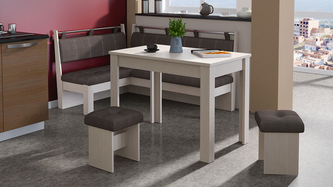 • Обеденная зона "Омега" состоит из удобной угловой скамьи, практичного стола и компактных табуретов.