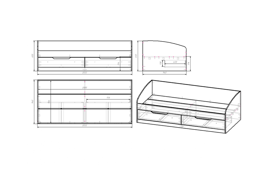 Длина ящиков 93.6 см, глубина 13.8 см. Максимальная нагрузка на кровать-тахту до 140 кг. Максимально допустимая высота матраса 20 см.